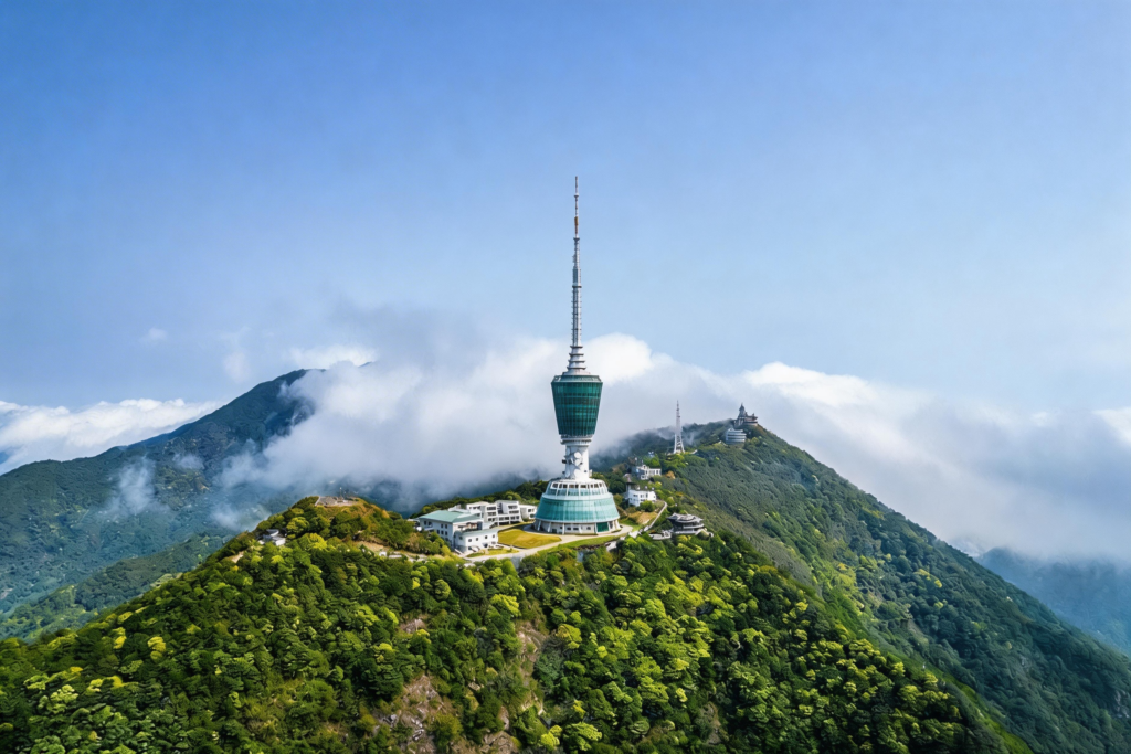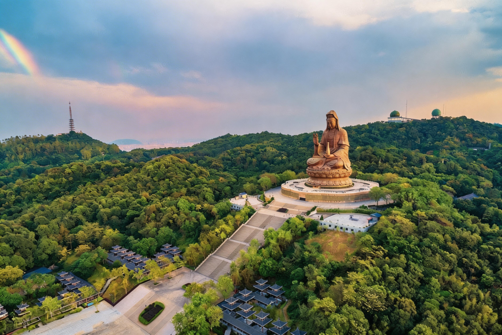 Xiqiao Mountain features ancient temples, serene forests, and sightseeing cable cars, with stunning views of volcanic geological wonders and Guanyin statues.