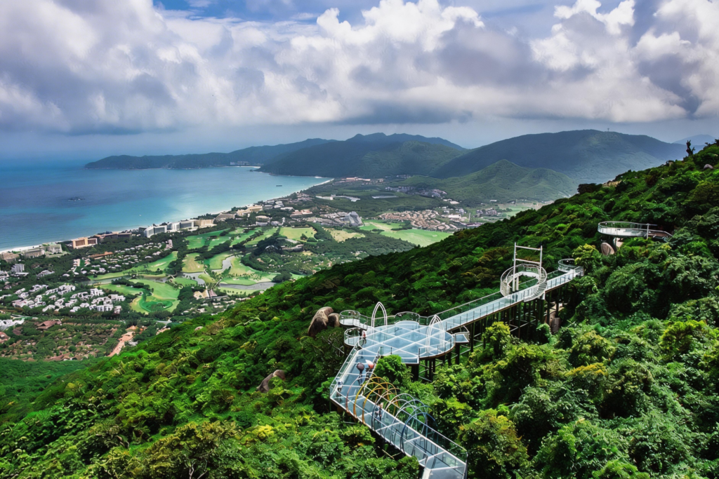 Walk on the full-sea-view glass plank road, overlook the 7-kilometer crescent-shaped coastline of Yalong Bay, and experience “walking in the clouds.”