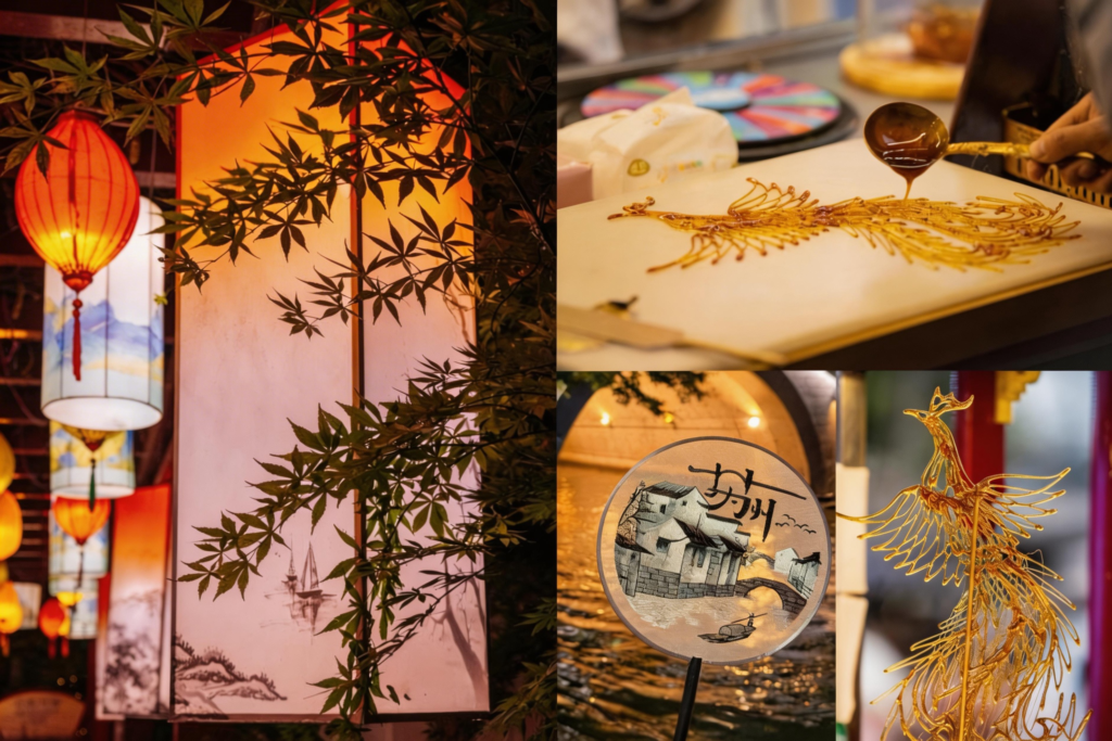 Take a painted boat to admire the reflection of red lanterns on both banks, visit intangible cultural heritage sugar painting and Su embroidery workshops, and experience the “Dream-seeking Shantang” light show.